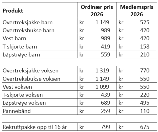 Kjøp av klubbtøy gjøres i forbindelse med treninger fra klubbhuset.